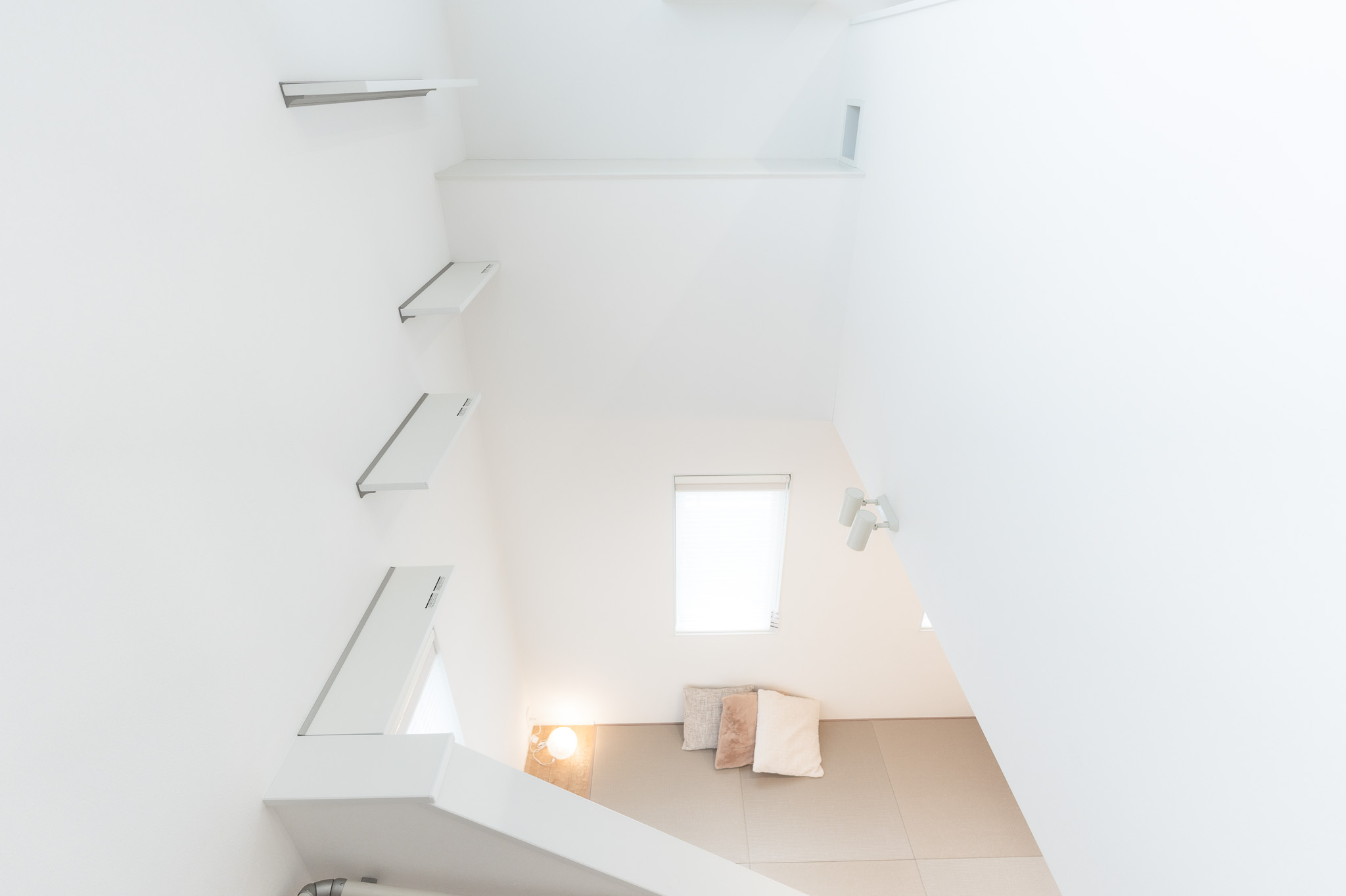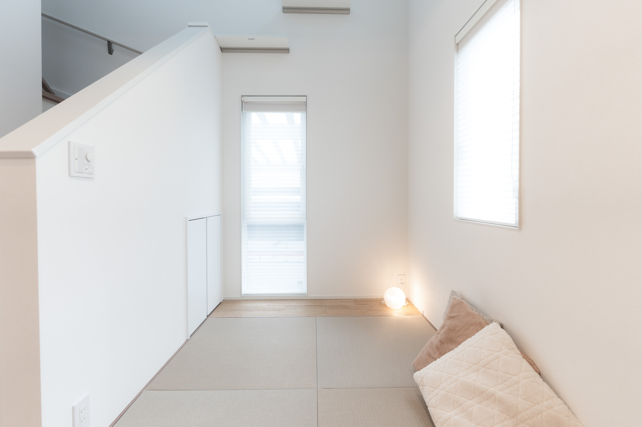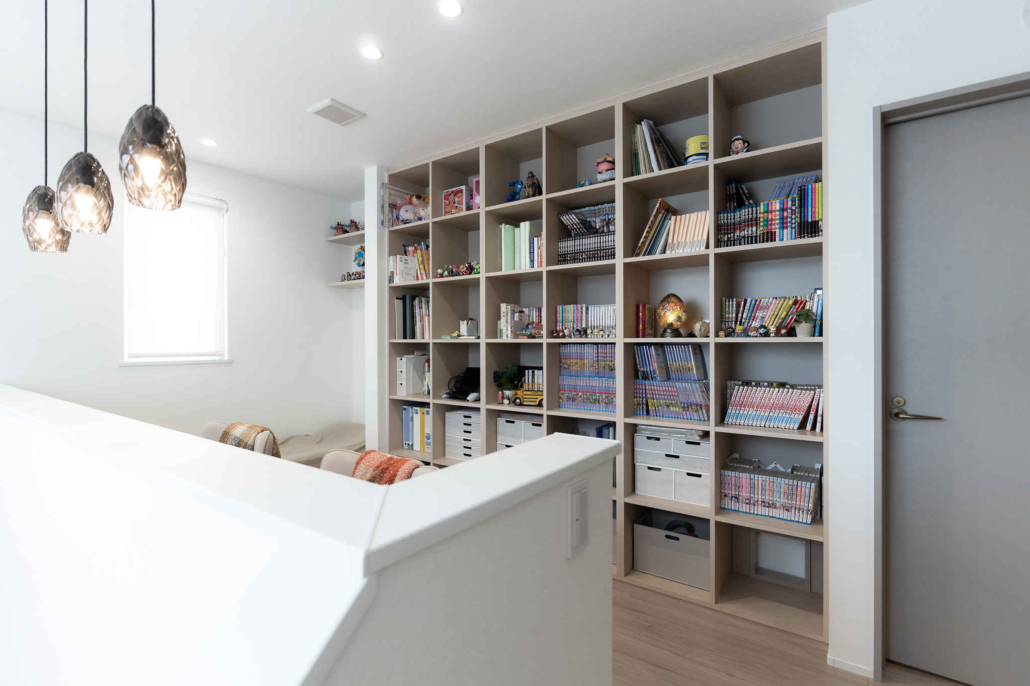 2階のホールは、ただの通路ではありません。仕事スペースでもあり、ご家族みんなの好きな本や漫画、フィギュアが並ぶ巨大な本棚があり、そして心と体を整えるための特別な空間「ヌック」が備わっています。