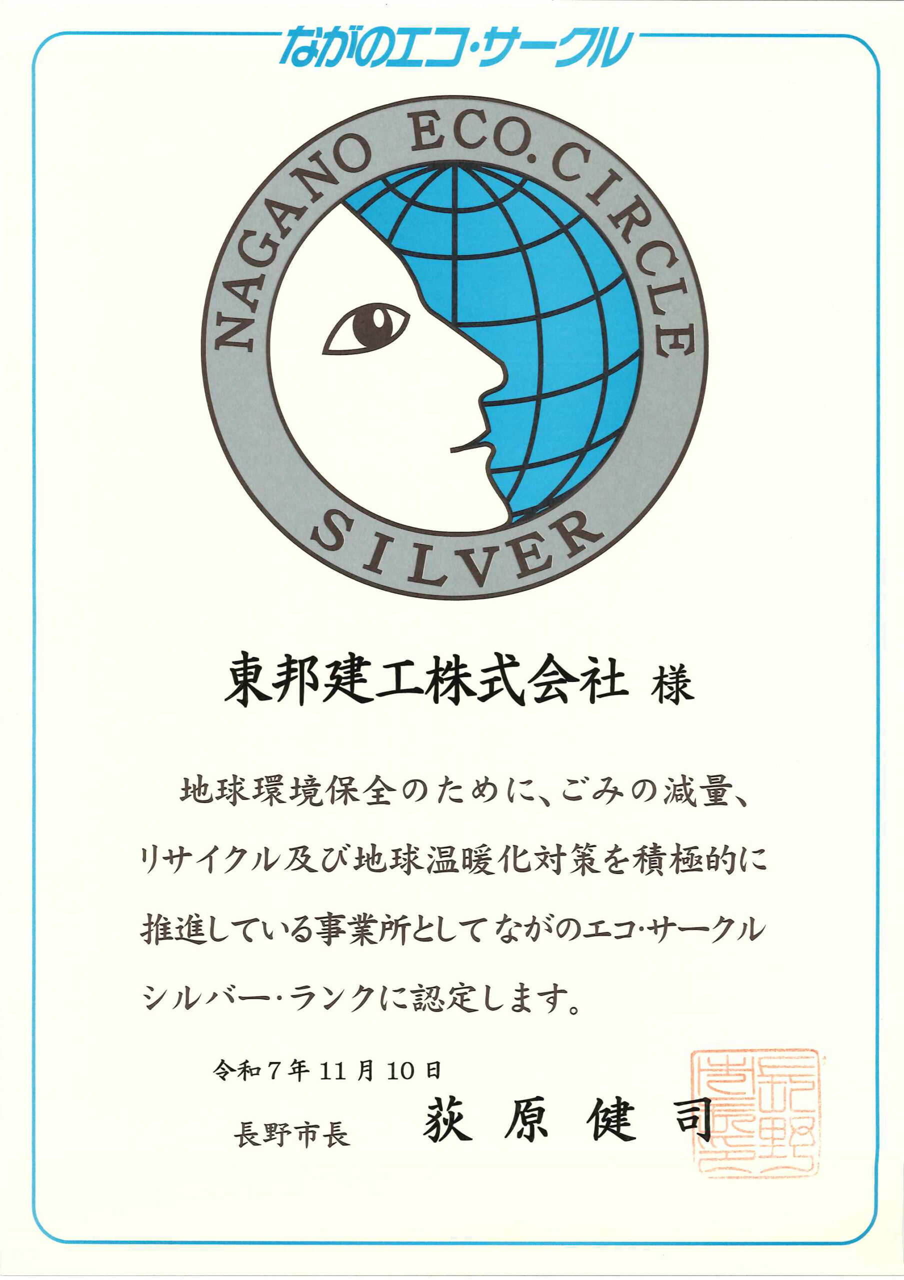 このたび、私たち東邦建工は、長野市が推進する環境配慮等の活動を行う事業所として認められ、「ながのエコ・サークル」の認定を受けました!