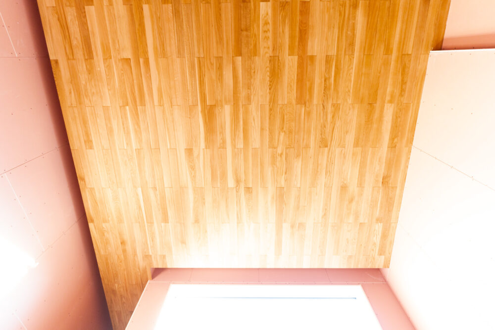 内部に目を戻すと、天井や壁のボードも張られ、だいぶお部屋の形が分かるようになってきました。着実に完成へと近づいている様子に、スタッフ一同ワクワクしています。写真の階段横のこの空間はなんでしょうか?気になりますね。