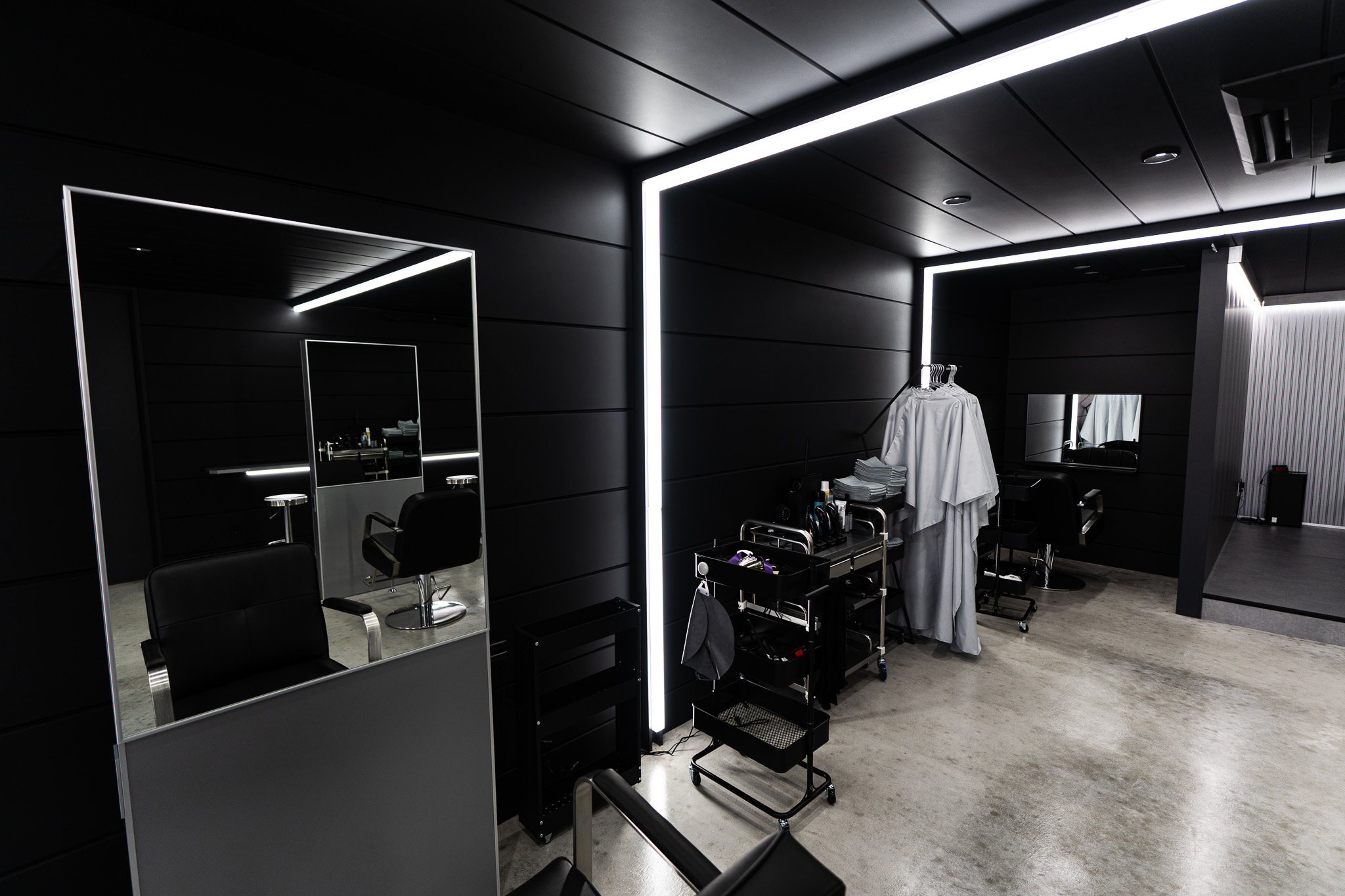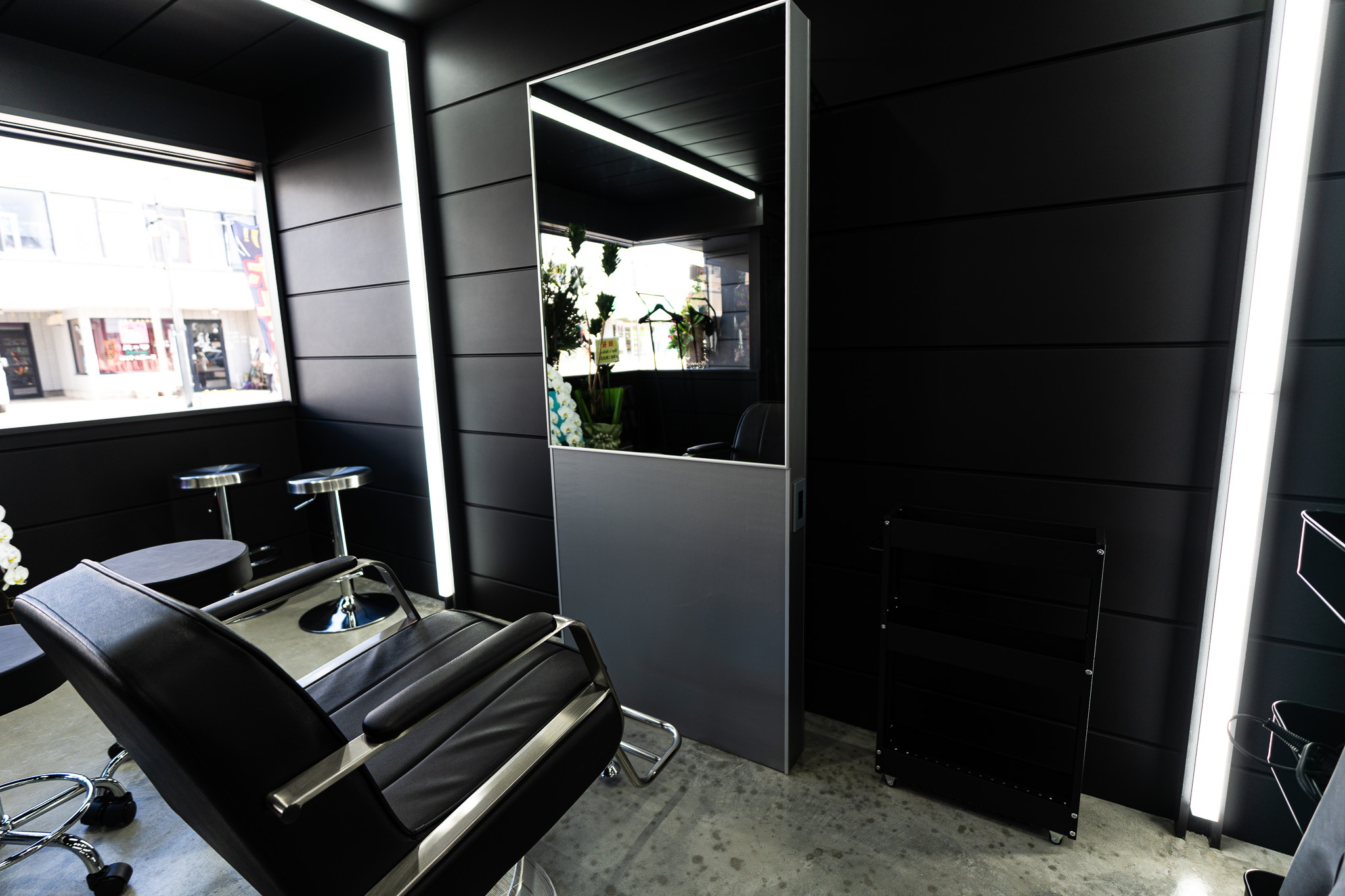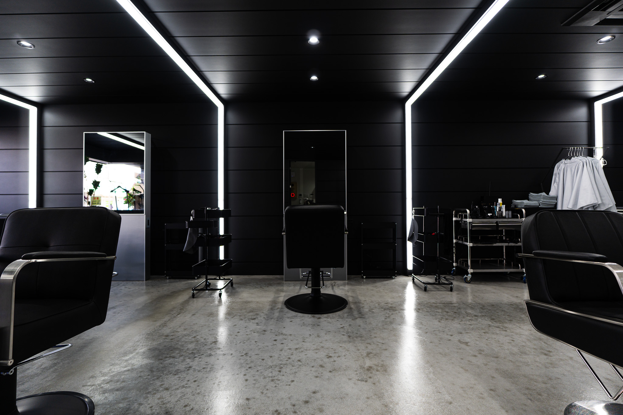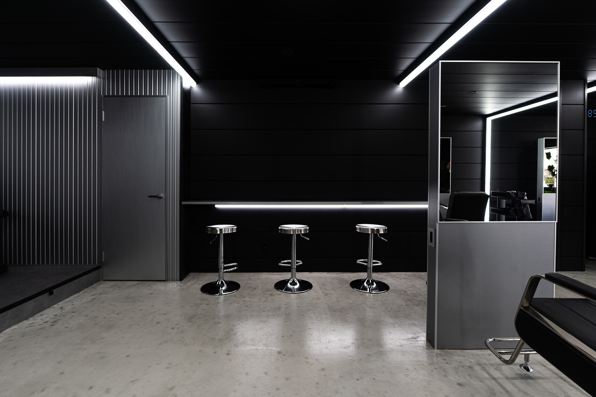 真っ黒な空間の中に、ライン照明そのものの光と、外壁材に反射した灯りが広がります。黒を基調としながらも決して「暗い」という印象はなく、普通の店舗とは全く違う、スタイリッシュで非日常的な空間が出来上がりました。