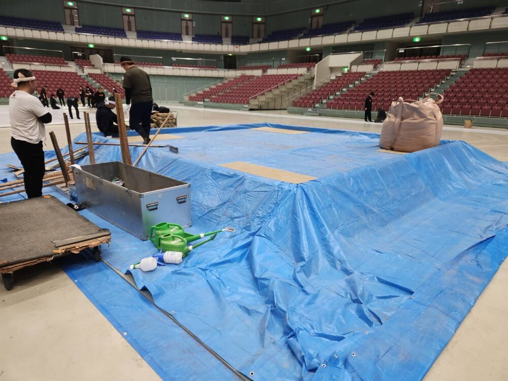 そんな大盛況の会場で、大変光栄なことに「のぼり旗の設営」と「土俵づくり」のお手伝いをさせていただきました。今回は、普段なかなか見ることのできない大相撲の設営の様子をレポートいたします!