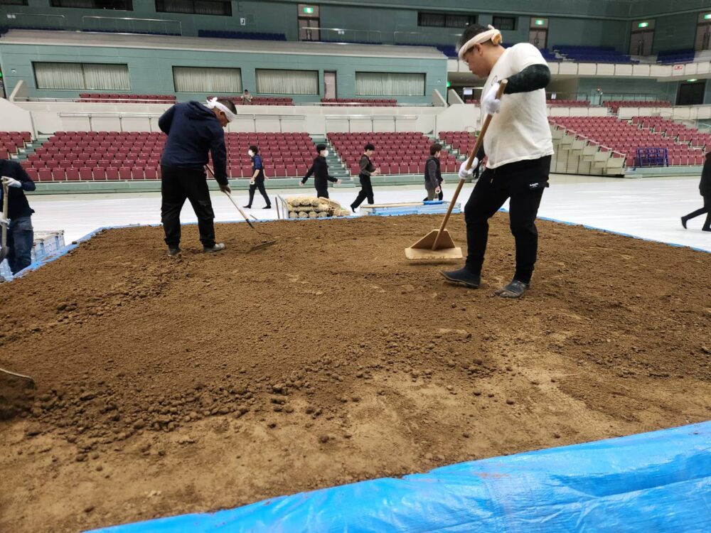 さらに今回は、のぼり旗の設営だけでなく、なんと「土俵づくり」までお手伝いさせていただくことに!これは私たちにとっても、なかなか出来ない大変貴重な経験です。