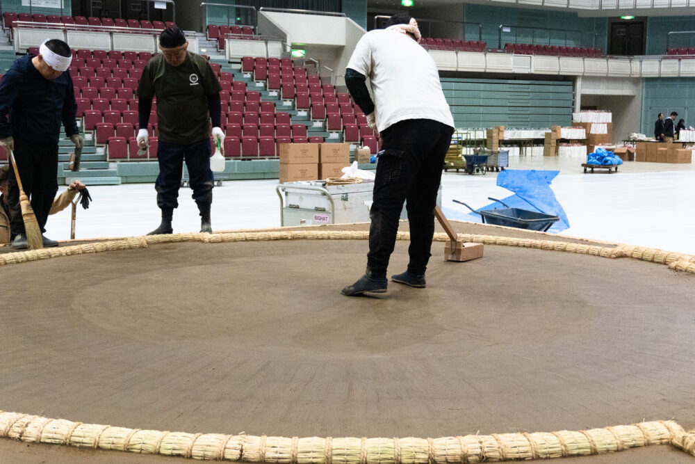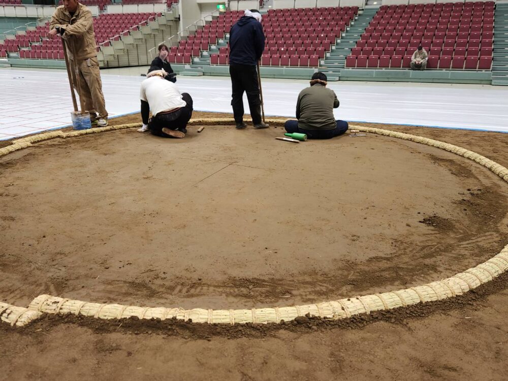 本場所の土俵はすべて土のみで築き上げますが、今回は巡業ということもあり、まずは型を組んでからその中に土を入れていくという特別な手法で作られました。