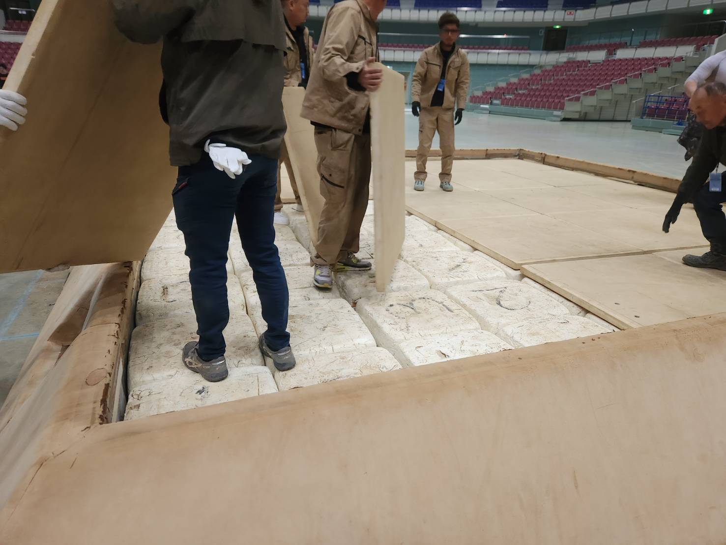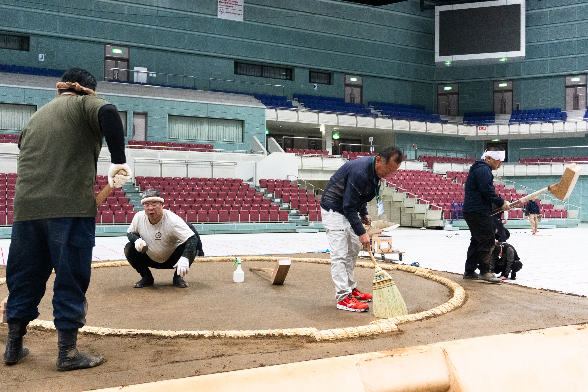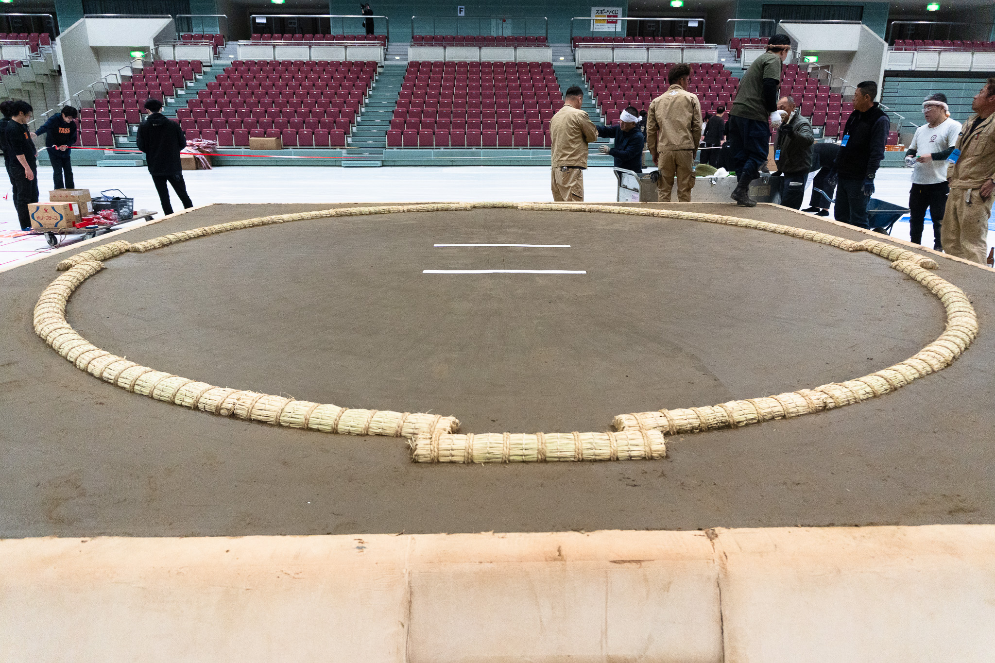 本場所の土俵はすべて土のみで築き上げますが、今回は巡業ということもあり、まずは型を組んでからその中に土を入れていくという特別な手法で作られました。
