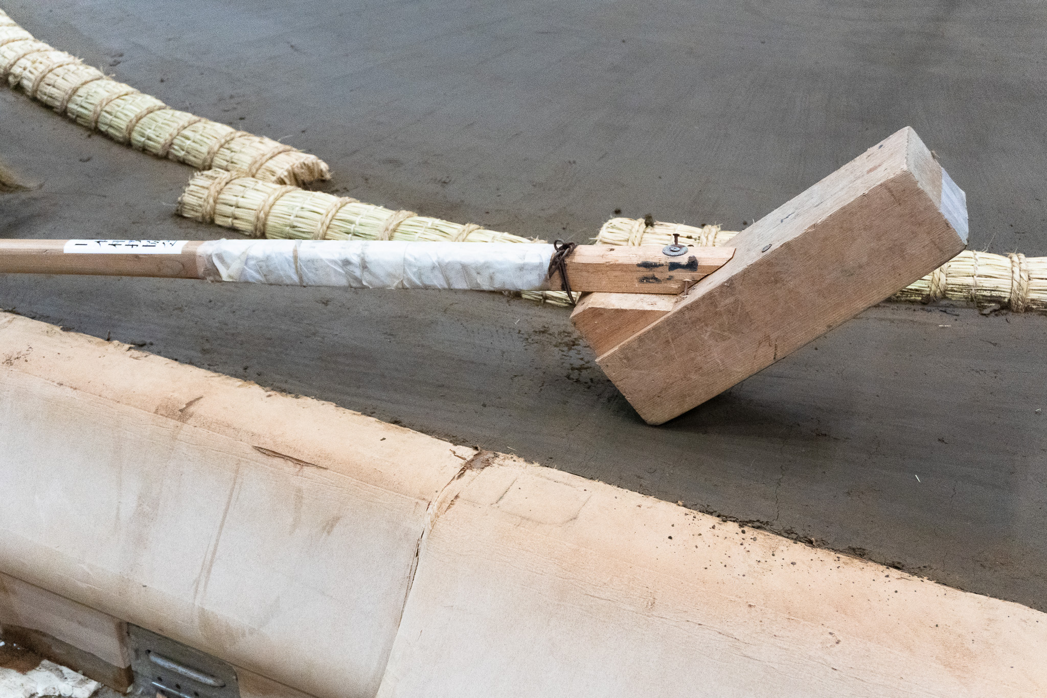 土俵の縁に俵(縄)を設置した後は、「大タタキ」と呼ばれる専用の道具を使い、力いっぱい土を何百回と叩いて固めていきます。土が柔らかいと力士が足を怪我しやすくなってしまうんだそうです。