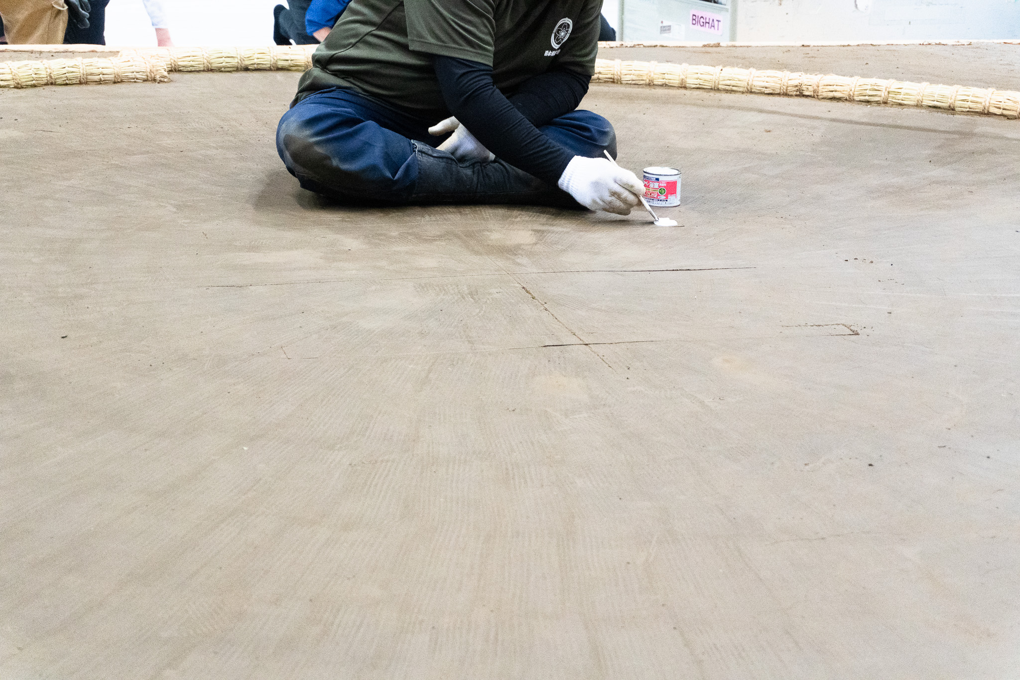 最後に、力士たちが立つ「仕切り線」を描き入れて、見事な土俵の完成!その土はとても固く、そして美しさがありました。