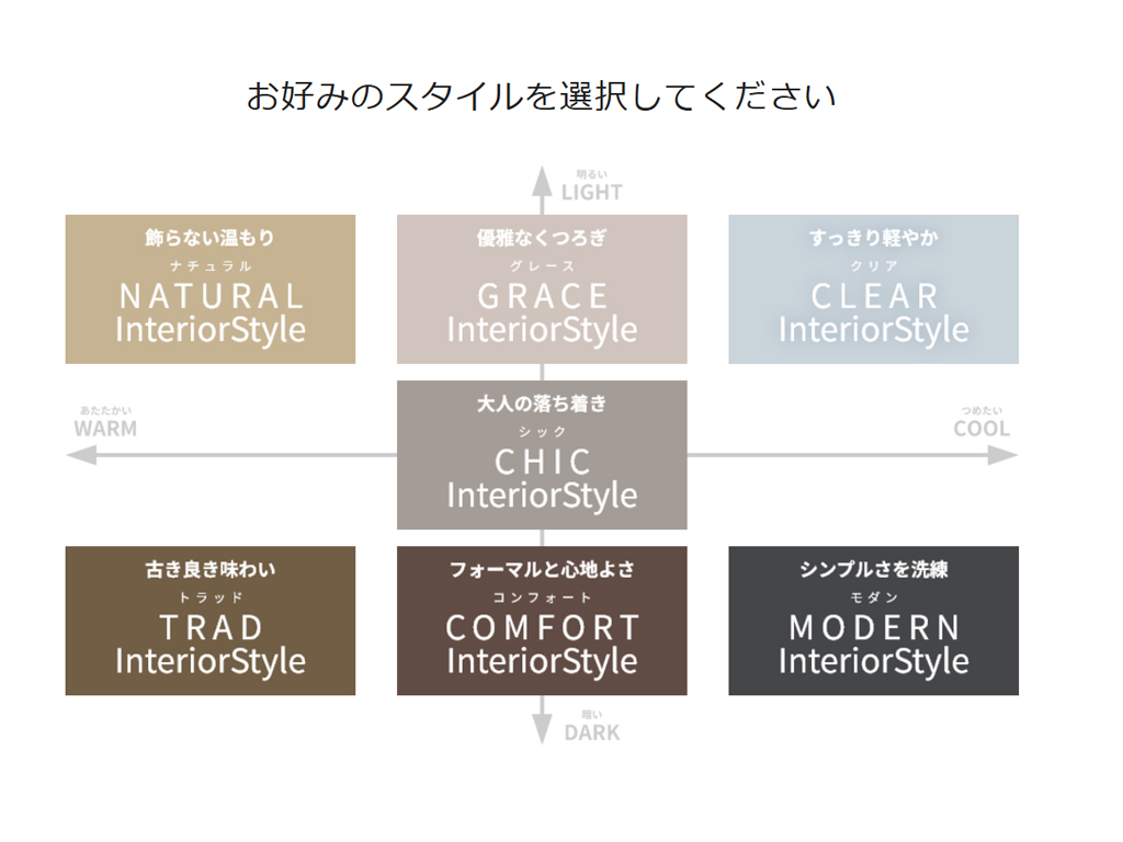 「全体的に明るい方がいいな」「シックで落ち着いた印象にしたいな」といった、ご自身のざっくりとした好みがなんとなくあると思います。