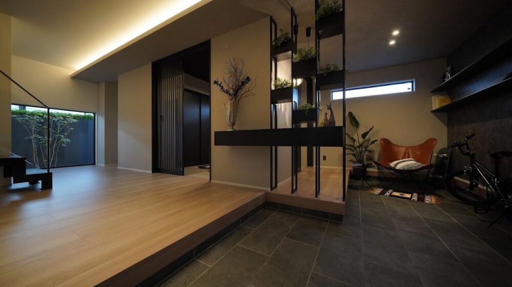 広々とした土間と、自転車やアウトドアグッズも余裕で置けるフリースペースが出迎えるエントランス。正面の大きなピクチャーウィンドウは、まるで一枚の絵画のように植栽の緑を映し出し、訪れる人の心をもてなします。土間から直接和室へアクセスできる動線は、ゲストをスムーズにお通しする際にも便利。デザイン性だけでなく、暮らしのあらゆるシーンを想定した工夫が詰まっています。