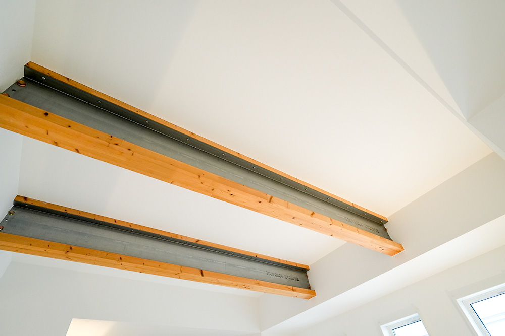 耐震等級3の基準をさらに上回る、パナソニックの耐震住宅工法「テクノストラクチャー」を採用。本モデルハウスでは、その心臓部とも言える「鉄と木のハイブリッド梁(テクノビーム)」を2階の天井にあえて露出させる(現し)デザインを取り入れました。「守られている」という確かな安心感を視覚的にも実感していただけます。