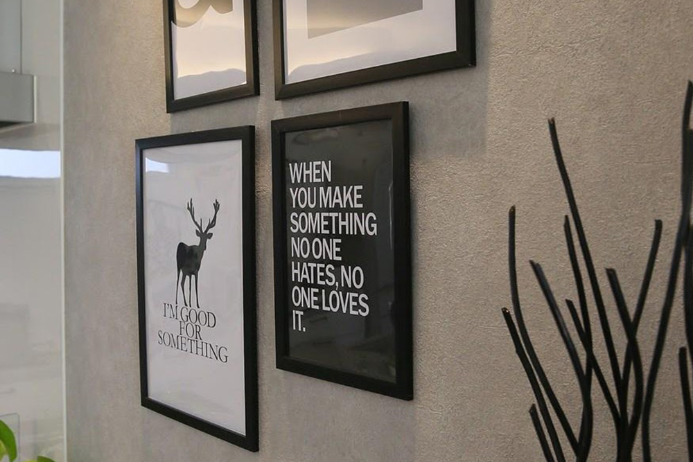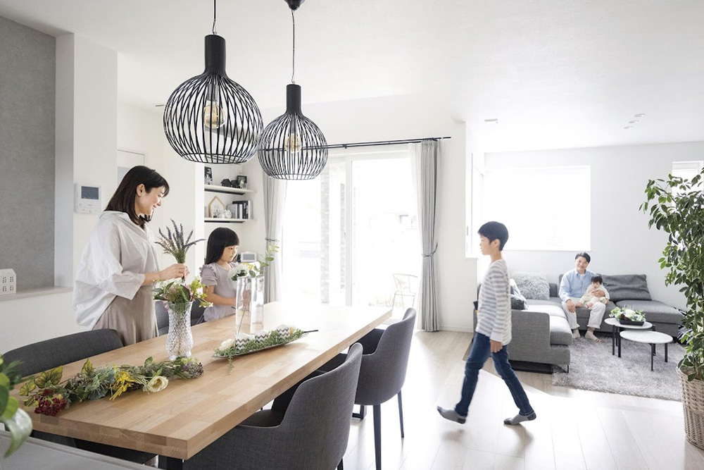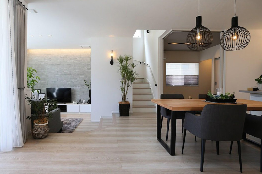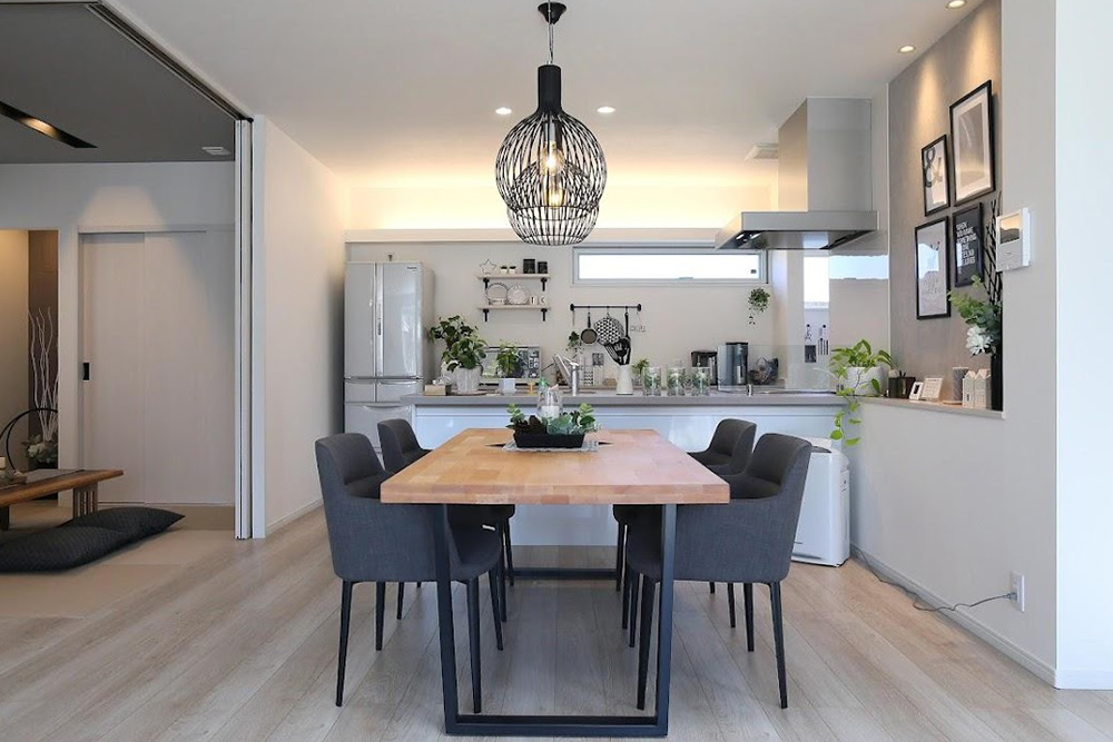 白と木目のナチュラルな空間がぼやけた印象にならないよう、計算された「黒」のアクセントが効いています。ダイニングの特徴的なワイヤーシェードのペンダントライトや、壁面のアートフレーム、そして家具の脚元などに黒を取り入れることで、空間全体をキリッと引き締めました。「ナチュラル」な中にも都会的な要素を少し加えることで、男性にも女性にも好まれる、飽きのこないモダンデザインに仕上がっています。