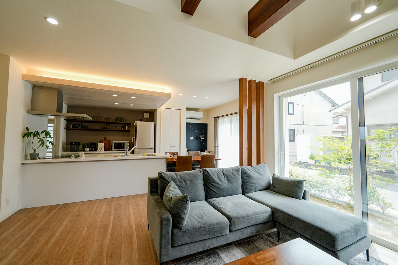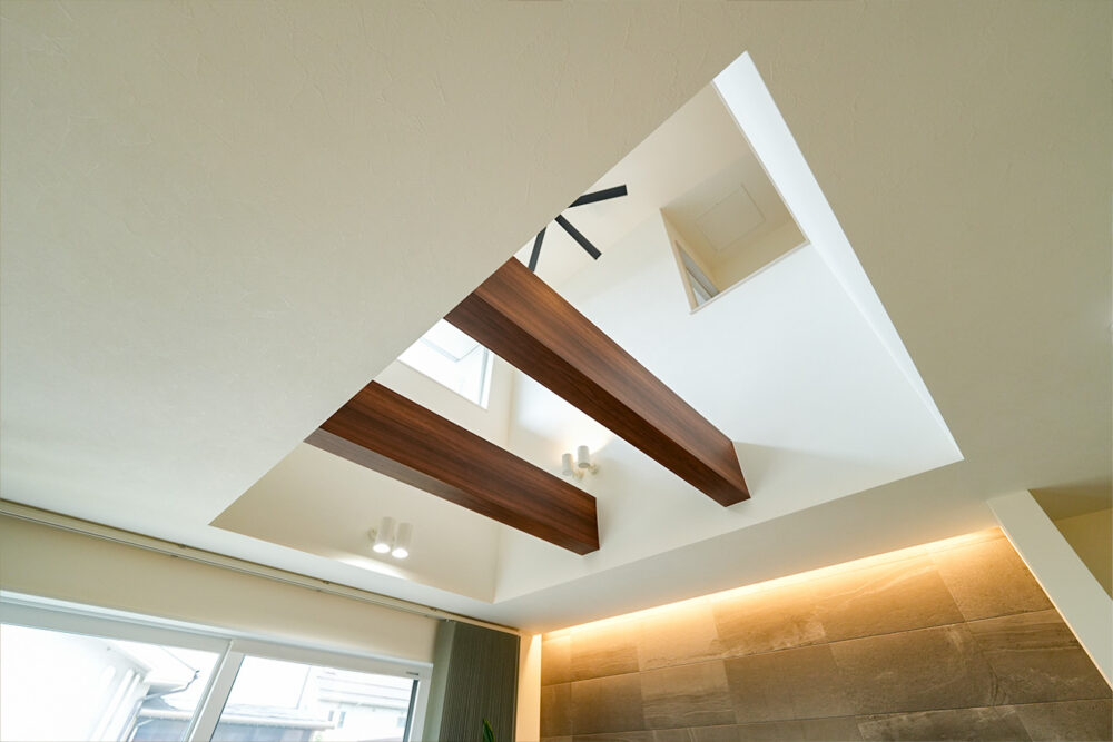 家族が自然と集まるリビングのソファ。その真上に広がるのは、ダイナミックな吹き抜けです。構造上は必要のない梁を“あえて”見せることで、空間のアクセントと木の温もりをプラス。視線が気持ちよく空へと抜け、実際の面積以上の開放感と、構造美が織りなす心地よさを体感いただけます。