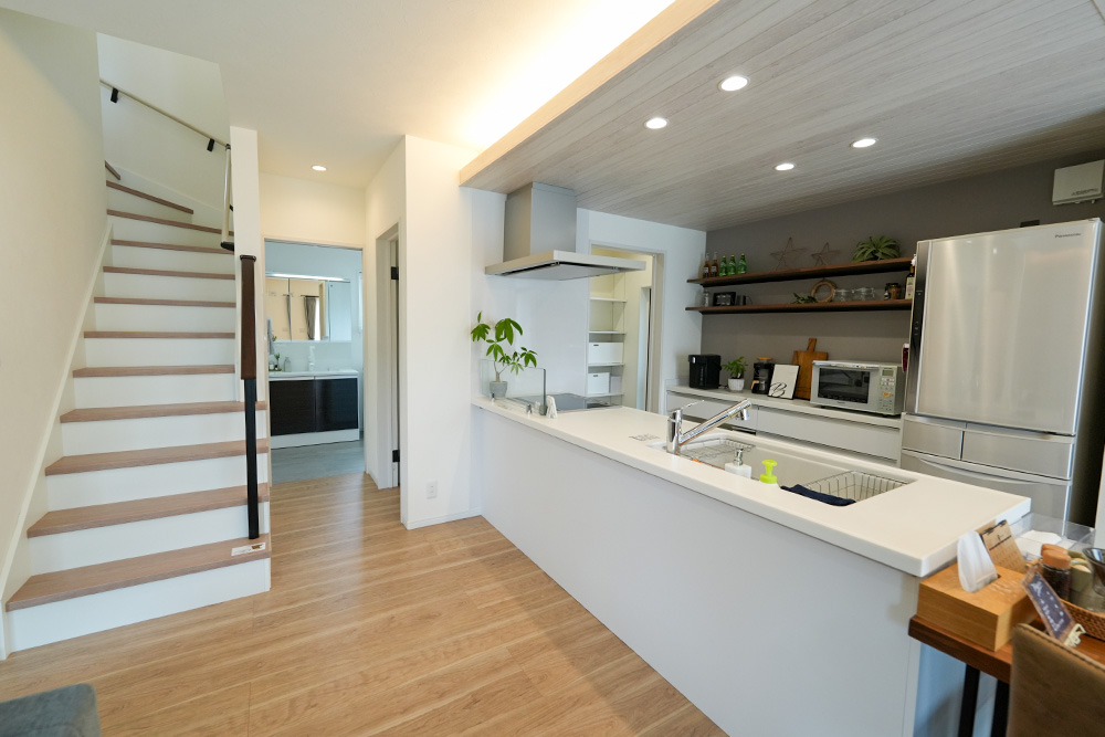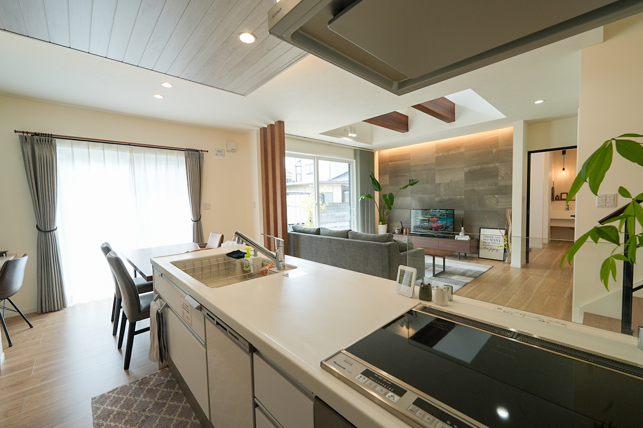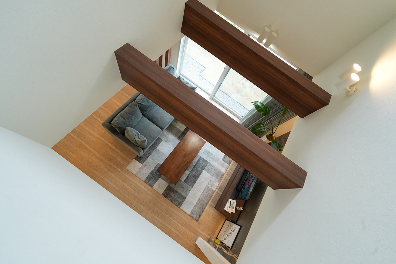 ソファから見上げる、高く広がる吹き抜け。そこにあるのは、「縦への広がり」という贅沢です。リビングをいつでも明るく、開放的な雰囲気で満たしてくれます。