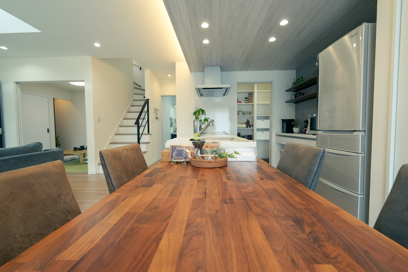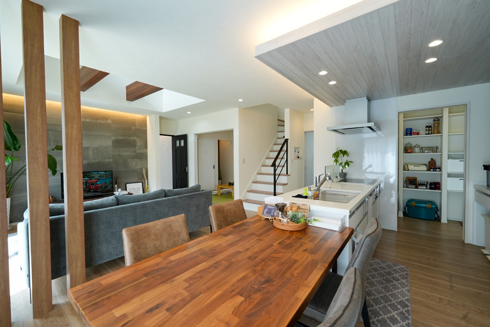 この家のデザインの“キモ”は、随所にあしらわれた「格子」です。構造上必要のない柱をあえて並べたり、空間をさりげなく仕切ったり。光と視線を柔らかく通しながら、和の趣とモダンな雰囲気を両立させます。木の温もりが、家族の時間を優しく包み込むデザインの核をご覧ください。