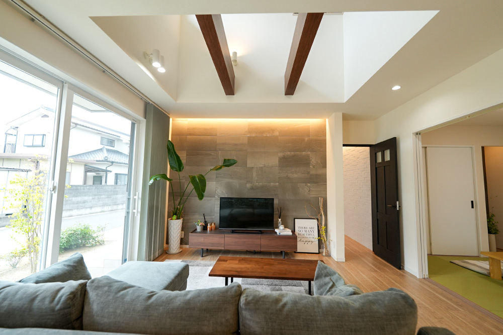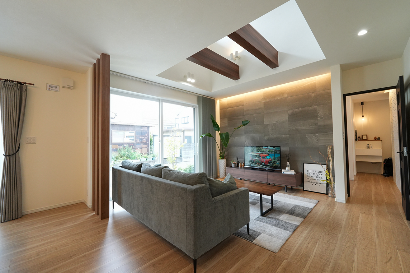 テレビの背面には、壁自体が主役となるアクセントウォールをしつらえました。間接照明に美しく照らし出されるのは、優れた消臭・調湿効果を持つ高機能タイル「エコカラット」。見た目のお洒落さだけでなく、リビングの空気を一年中快適に保ちます。デザインと機能を両立した、ワンランク上の空間演出です。