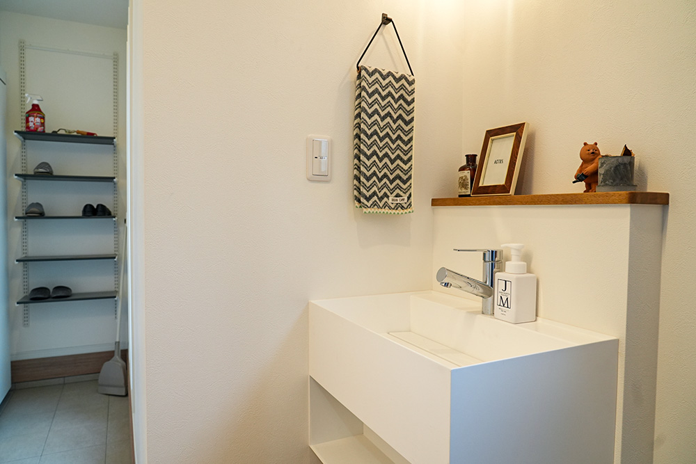 玄関を入ると、すぐ隣にデザイン性の高い手洗い洗面を設置。そのままファミリークロークへ直行し、コートや荷物を片付けられます。「手洗い・着替え・片付け」がリビングに入る前に完結するから、家の中はいつも清潔。共働き家族の忙しい毎日を支える、究極の時短・お帰り動線です。