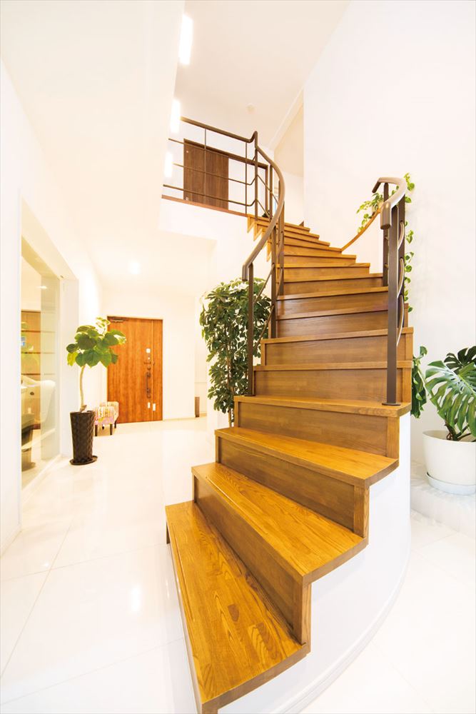 第2のこだわりは、家の中央を貫くカーブ階段。当初は玄関の上がり框の目の前に階段の上り口を設けたいと考えていたが、空間バランスがどうにも上手くいかない。
