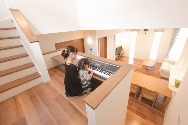 ご夫妻が希望したのは、どこにいても家族の声が聞こえ、子どもが成長しても毎日顔を合わせられる家。そこで取り入れたのが、リビング階段とスキップフロアだ。中2階の多目的スペースにはカウンターを造り付け、今はキーボードを置いているが、将来は子どもがここで勉強することを想定。