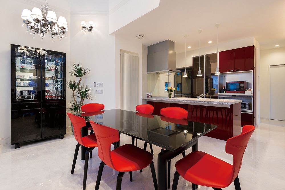 1階LDKは、黒と赤でモダンにコーディネート。「食べたり飲んだりが大好きな家族がにぎやかに集えるように」と、オープンキッチンを囲むワンルームに収めつつ、リビングとダイニングの上部は吹き抜けにしてメリハリをつけた。印象的なのが光の演出だ。日中は高窓から光がふんだんに差し込み、夜にはステンドグラスが幻想的な美しさを放つ。「夜に外から眺めると、昼とは違う表情でうっとり。ステンドグラスは作家の先生にイメージを伝えてオーダーしました」。住み手の好きなものや美意識を形にした、この世にひとつの住まいだ。